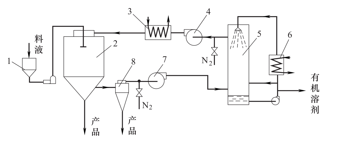 閉路循環(huán)噴霧干燥機系統(tǒng),是基于干燥介質(zhì)為惰性氣體(如N2氣等)的再循環(huán)和再利用。當(dāng)然,特殊情況下也可以用空氣,如空氣-四氯化碳系統(tǒng)。干燥系統(tǒng)部件間的連接處,要保證氣密性密封,干燥室在低壓(約200mmH2O左右,即0.196kPa)下操作。其流程如圖所示。